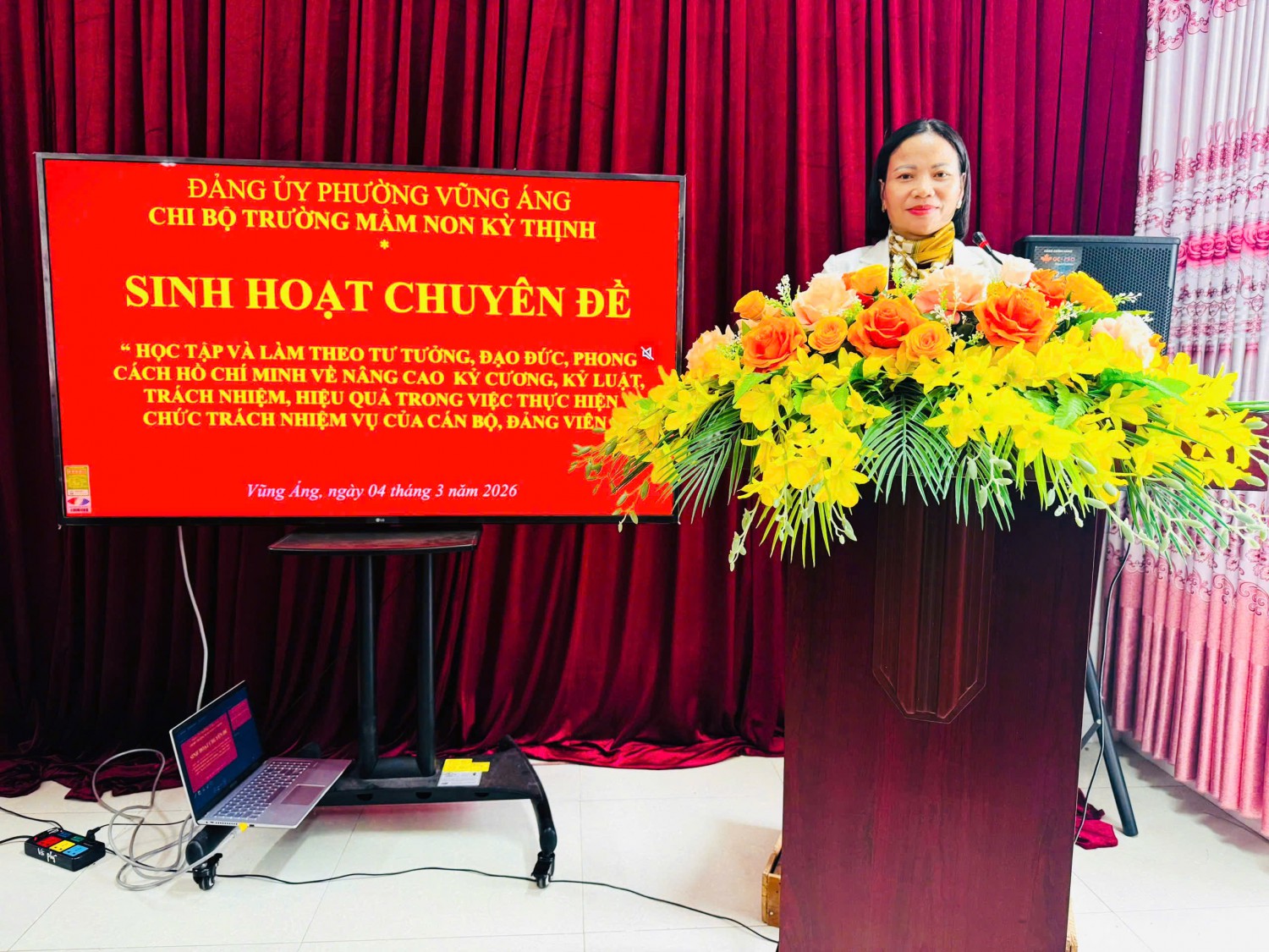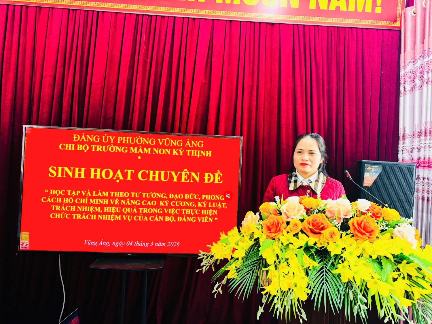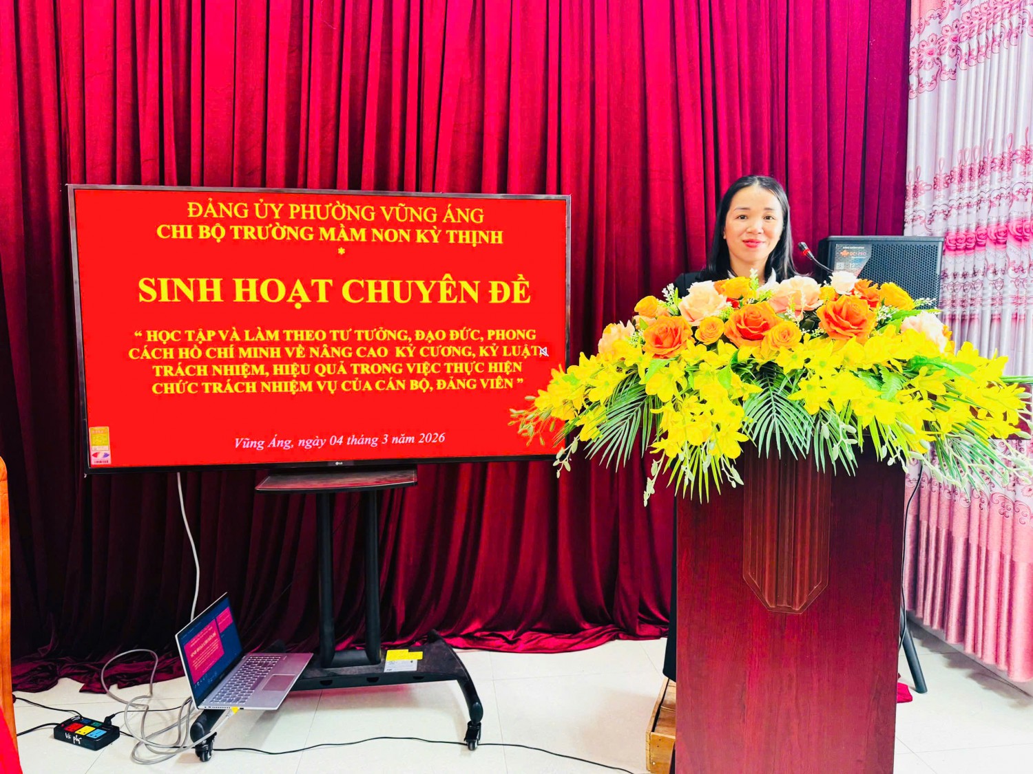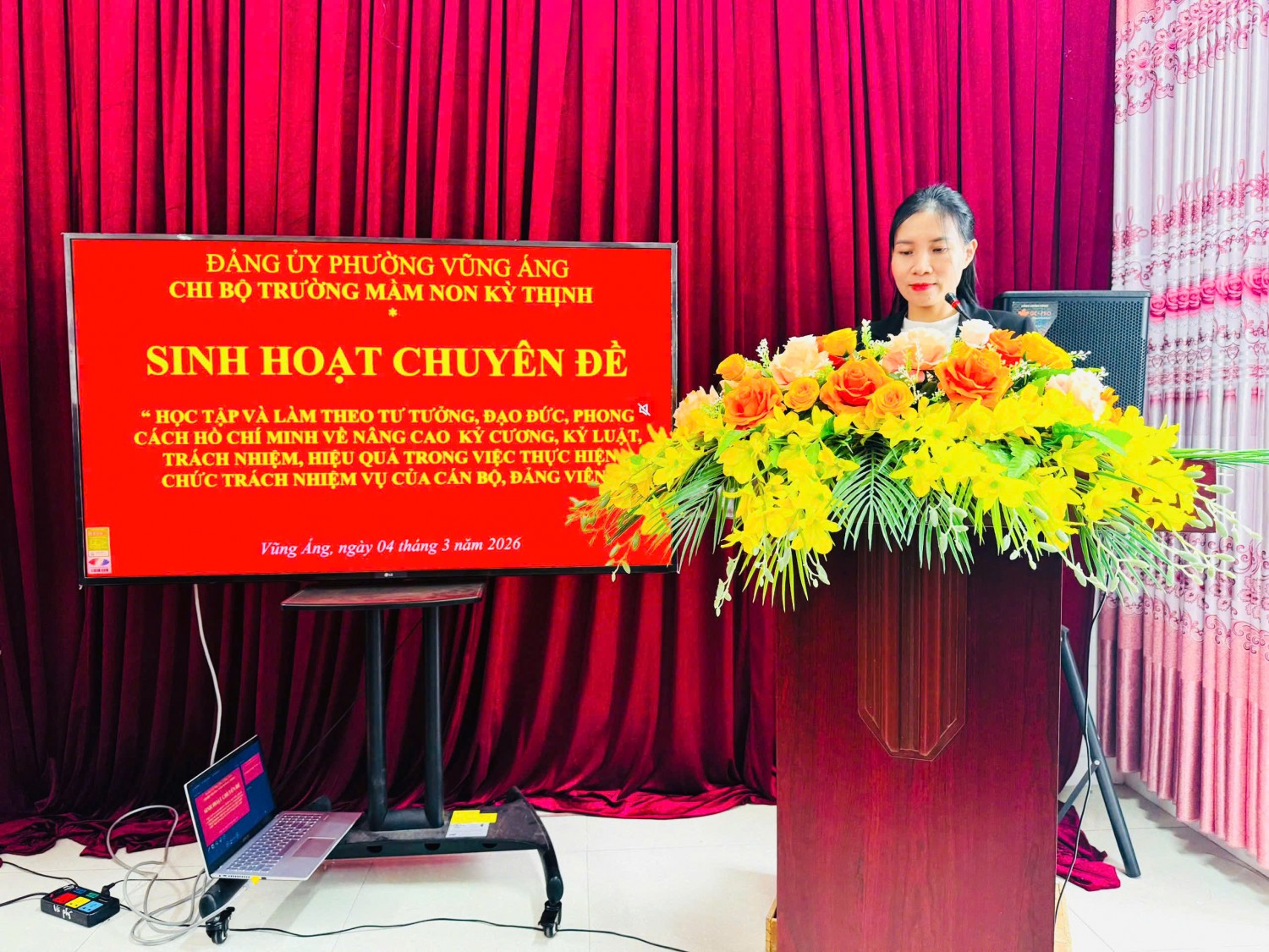 tư tưởng, đạo đức, phong cách Hồ Chí Minh về nâng cao kỷ cương, kỷ luật, trách nhiệm, hiệu quả trong thực hiện chức trách, nhiệm vụ của cán bộ Đảng viên là một vấn đề bức thiết và cần phải tiếp tục thực hiện, nhằm nâng cao năng lực lãnh đạo, sức chiến đấu của tổ chức cơ sở Đảng, đáp ứng nhiệm vụ GDMN trong tình hình mới. Đồng thời nắm bắt kịp thời tình hình tư tưởng chính trị của Đảng viên và quần chúng trong nhà trường, thông qua đó để có giải pháp và biện pháp lãnh đạo phù hợp để phát huy tích cực, ngăn chặn tiêu cực trên cơ sở đường lối chủ trương của Đảng, chính sách pháp luật của Nhà nước, giải quyết kịp thời những phát sinh chưa chuẩn mực trong mối quan hệ công tác, sinh hoạt của cán bộ, Đảng viên và viên chức Nhà trường nhằm giữ gìn, củng cố sự đoàn kết trong Chi bộ Đảng và trong Nhà trường.