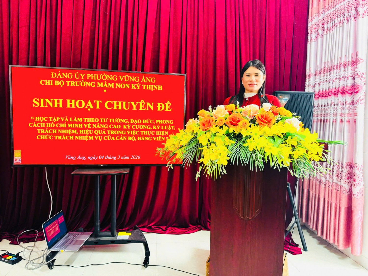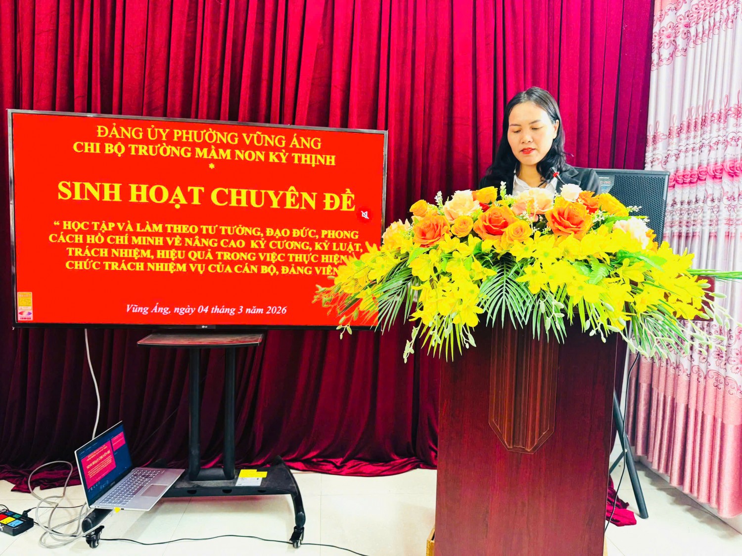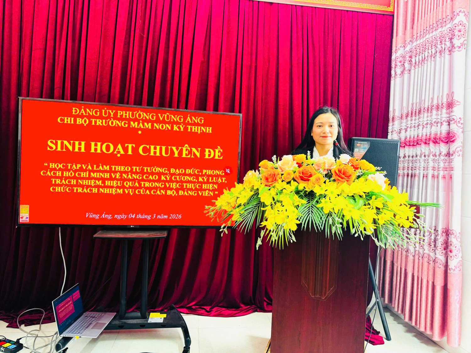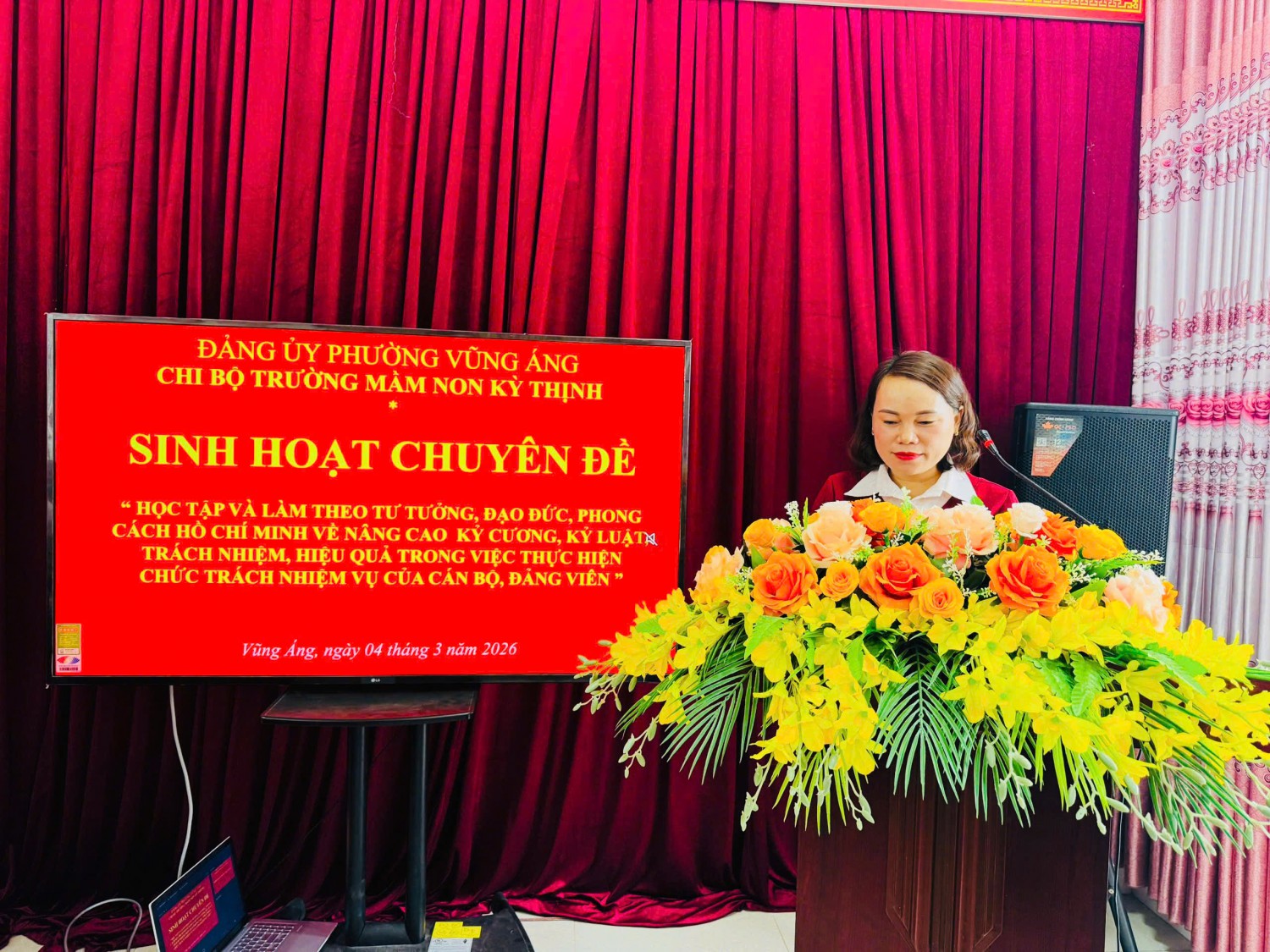 tư tưởng, đạo đức, phong cách Hồ Chí Minh về nâng cao kỷ cương, kỷ luật, trách nhiệm, hiệu quả trong thực hiện chức trách, nhiệm vụ của cán bộ Đảng viên là một vấn đề bức thiết và cần phải tiếp tục thực hiện, nhằm nâng cao năng lực lãnh đạo, sức chiến đấu của tổ chức cơ sở Đảng, đáp ứng nhiệm vụ GDMN trong tình hình mới. Đồng thời nắm bắt kịp thời tình hình tư tưởng chính trị của Đảng viên và quần chúng trong nhà trường, thông qua đó để có giải pháp và biện pháp lãnh đạo phù hợp để phát huy tích cực, ngăn chặn tiêu cực trên cơ sở đường lối chủ trương của Đảng, chính sách pháp luật của Nhà nước, giải quyết kịp thời những phát sinh chưa chuẩn mực trong mối quan hệ công tác, sinh hoạt của cán bộ, Đảng viên và viên chức Nhà trường nhằm giữ gìn, củng cố sự đoàn kết trong Chi bộ Đảng và trong Nhà trường.