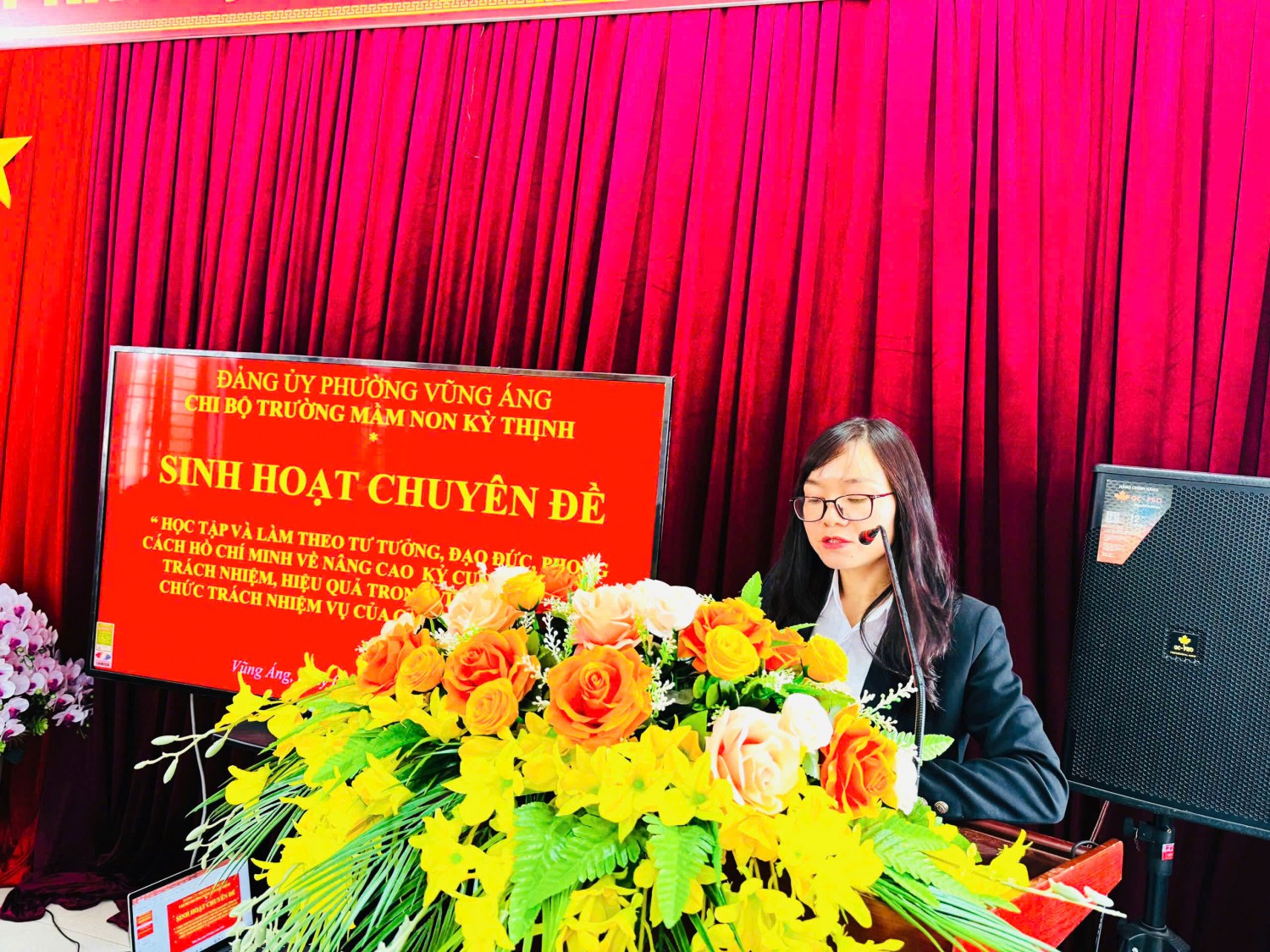 Đ/c Lê Thị Thu Hà Bí thư chi bộ khai mạc chuyên đề. Tại buổi chuyên đề các đồng chí Đảng viên trong Chi bộ đã được Chi ủy tổ chức, quán triệt kịp thời, nghiêm túc các Chỉ thị, Nghị quyết của Đảng các cấp và đã xây dựng được các chương trình hành động cụ thể theo từng tuần, từng tháng và thực hiện có hiệu quả. Lắng nghe 9 ý kiến phát biểu tham luận của các Đ/c đảng viên trong Chi bộ. Các ý kiến tham luận góp ý chân thành, thẳng thắn đưa ra được các giải pháp trọng tâm trong thời gian tới. Chi bộ cần tiếp tục tạo sự chuyển biến mạnh mẽ về nhận thức, trách nhiệm của các cấp ủy, tổ chức Đảng và đảng viên quán triệt và thực hiện Đã tuyên truyền, triển khai tới 100% các đồng chí Đảng viên trong Chi bộ thực hiện nghiêm túc việc học tập và làm theo